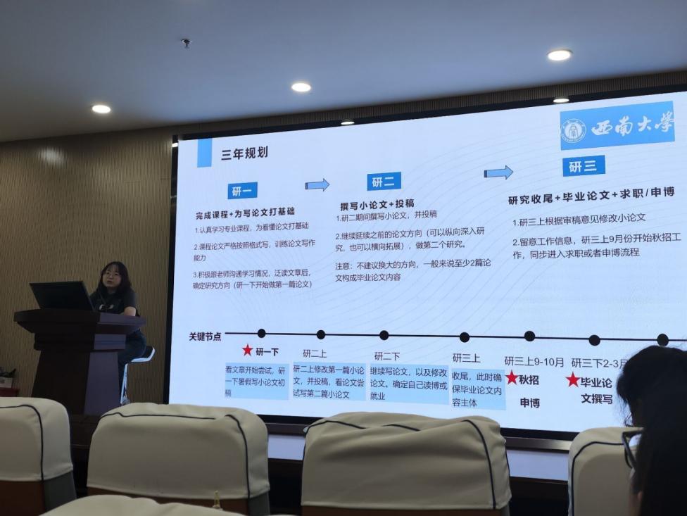 随后,邱鑫从规划、科研、发展三方面展开分享。对于研究生三年的时间规划,邱鑫建议:研一阶段以课程学习和基础知识储备为核心任务,在春季学期结束前明确研究方向;研二重点进行学术论文撰写与发表工作;研三同步推进毕业论文撰写与职业发展规划。邱鑫特别指出,确定研究方向(研一下)和求职申博准备期(研三上)是该规划体系的关键节点。谈及科研经验,邱鑫强调了文献研读的系统性,建议选择本领域10―15篇高质量论文进行深度解析,重点关注研究方法和论证逻辑。对于论文写作,她提出"核心突破法"——优先完成关键证明环节的推导与验证,再进行全文框架梳理,以此提升完成效率,并提醒同学们定期与导师保持沟通,协同解决研究难题。邱鑫强调,无论是就业还是申博,都一定要提前完成学院、导师等制定的任务,为未来的安排留出充分的准备时间。