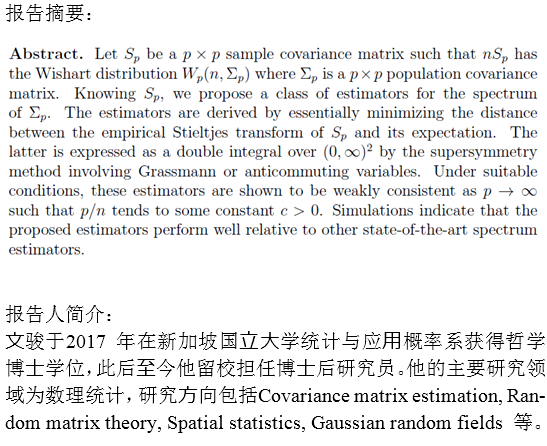 报告题目:Estimating the spectrum of a high dimensional covariance matrix via anticommuting variables