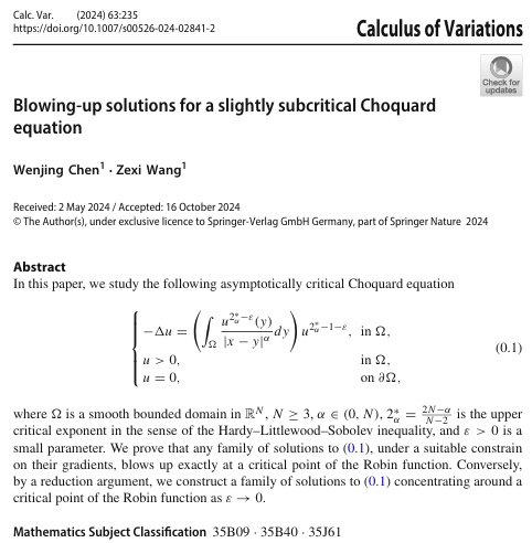 近日,学院博士研究生王泽玺与其导师陈文晶教授合作的论文“Blowing-up solutions for a slightly subcritical Choquard equation”在国际著名期刊《Calculus of Variations and Partial Differential Equations》上发表,365英国上市集团为第一完成单位。