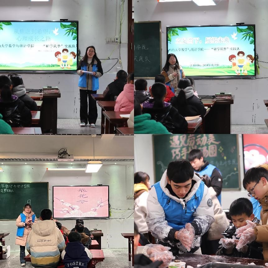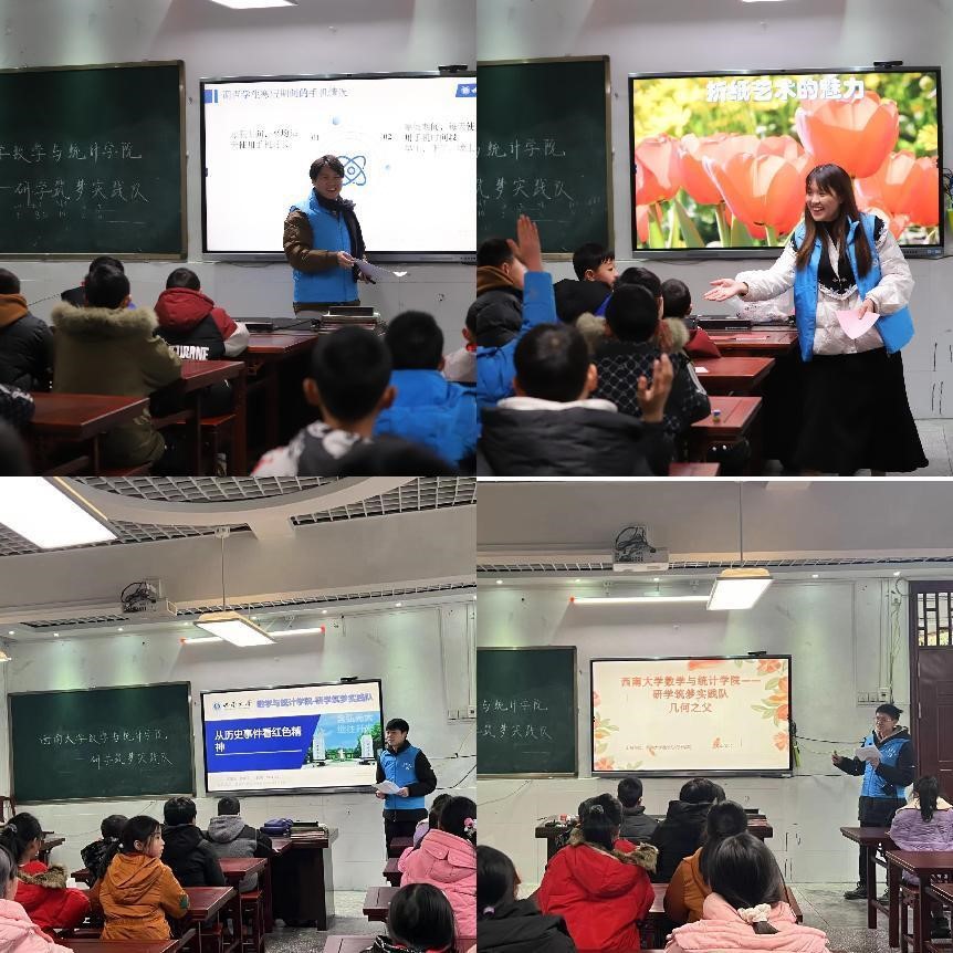 为助力西部地区基础教育高质量发展,践行青年学子在乡村振兴中的使命担当,365英国上市集团数学与统计学院积极响应学校关于开展2024年寒假研究生社会实践活动的号召,组建“研学筑梦”实践队,于2月20日至2月23日赴重庆市城口县咸宜小学开展“红色研学筑新梦,帮扶到校共成长”主题实践帮扶活动。活动开展成效显著,获光明日报客户端、环球时报客户端、重庆日报客户端等6家主流媒体报道。