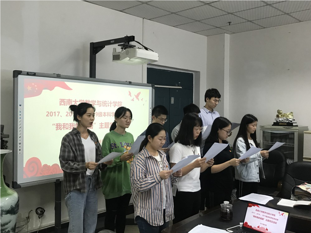 冉思燕同志首先向李华书记介绍了本支部的情况。随后,何婧同志带领全体成员学习了《习近平在“不忘初心,牢记使命”主题教育工作会议上的讲话》,张丝腴、李杨港、犹普欢三位同志联系自身情况,讲述了作为一名公费师范生的初心;李小双同志带领大家学习了习近平总书记重要文章《牢记初心使命,推进自我革命》,马呈哲、曾煜彬、冉思燕、谭凌骏四位同志结合自身实际发表了学习心得体会。接着,支部全体党员与李华副书记一起观看视频《厉害了,我的国》,全体学生党员朗诵诗歌《中国,我的中国》并合唱《今天是你的生日》,以表达对祖国70华诞的美好祝愿。