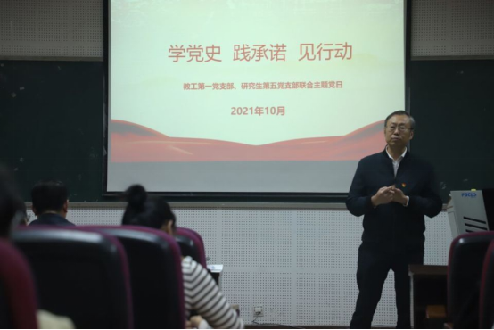 2021年10月15日下午,学院教工第一党支部、研究生第五党支部在25教14楼报告厅联合开展主题党日活动。学校党委副书记安春元、学院党委书记易遵尧出席,学院教工第一党支部、研究生第五党支部全体党员参加,教工第一党支部书记喻厚义主持本次党日活动。
