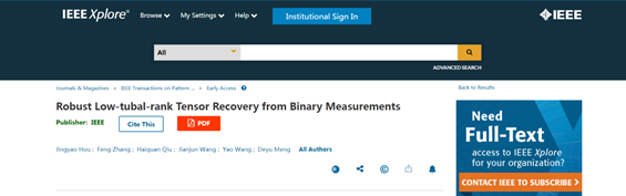 近日,我院王建军教授团队在人工智能领域——高维数据挖掘与机器学习方面再次取得突破性进展,以“Robust Low-tubal-rank Tensor Recovery from Binary Measurements(基于二值测量的稳健低管秩张量恢复)”为题的研究论文被国际权威顶级期刊IEEE Transactions on Pattern Analysis and Machine Intelligence(IEEE TPAMI,IF:17.861)(《IEEE模式分析与机器智能汇刊》)录用为长文(Regular Paper)并已在线发表。IEEE TPAMI是人工智能、模式识别、计算机视觉及机器学习领域国际最顶级期刊,是中国计算机学会(CCF)推荐的为数不多的人工智能领域A类期刊。365英国上市集团为成果的第一完成单位及第一通讯作者单位,我院博士研究生侯景耀为该论文的第一作者,王建军教授为通讯作者。这也是王建军教授团队近两年内在IEEE TPAMI上发表的第二篇高水平研究论文。