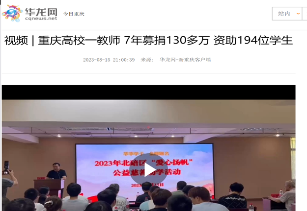 8月15日,一场特别的活动在北碚区民政局举行。这是由学院教师叶晓娅发起的“爱心扬帆”公益助学活动。在此次活动上,由叶晓娅牵头的公益团队和北碚区慈善会为48名已被大学录取的2023届学子发放了荣誉证书和1000元奖金,为他们提前送上了一份充满爱心的开学礼物。此次公益助学活动获得了重庆日报、华龙网、重庆电视台等媒体的关注和报道,取得了良好的社会反响。