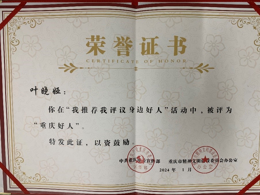 我院叶晓娅教师入选重庆市2023年第四季度“重庆好人榜”