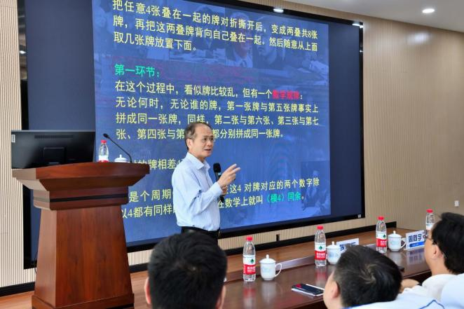 报告伊始,周向宇院士从春晚魔术讲起,“魔术师通过一系列复杂的操作和设计,成功将抽象的数学问题转化为生动有趣的魔术表演”,带领师生们共同揭秘魔术背后所蕴含的数学原理设计——同余理论,引出“物不知数”问题及孙子 “神机妙算”之解、中国剩余定理等数学思想,中国古代数学“言约旨远”,由浅入深,激发在场师生探索数学奥秘。紧接着,周向宇院士基于发表于《数学学报》的学术论文,详细解说了《周髀算经》中勾股定理、《孙子兵法》中神机妙算、《九章算术注序》中重差公式,介绍了中国古代关于数论、代数运算、无穷与极限的思想,也为在场师生复原了中国古代数学中勾股定理的商高证明,揭示其蕴含的商高“折矩”原理、“积矩”思想、商高-赵爽“形体不变量”思想。随后,周向宇院士通过结合古代实例,由高次方程的数值解的问题引出了唐朝的王孝通的伟大思想成果,这是数学智慧与古代现实生活碰撞的火花,也是我国古代数学家的伟大成就,引领师生深刻体会中国古代数学的魅力。