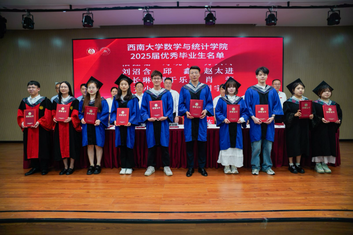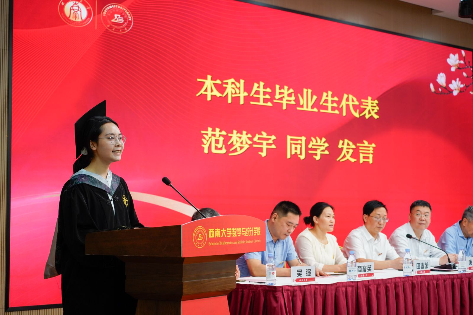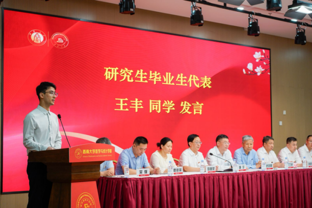 2022级硕士毕业生王丰作为研究生代表发言,深情回顾七年西大求学岁月,呼吁同学们以数学的严谨思维与教育的温暖情怀服务社会、回馈时代。2021级数学与应用数学师范专业本科生范梦宇作为本科毕业生代表,分享了自己从“被师范星火点亮”到“成为持炬者”的成长蜕变,誓言将扎根教育沃土,践行“特立西南,学行天下”的校训精神。