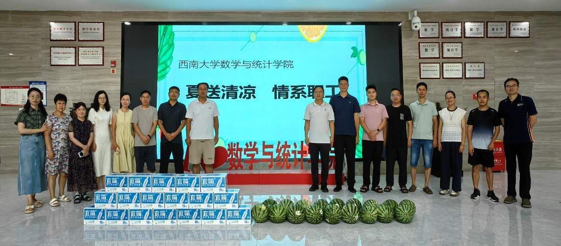 8月15日上午,学院党委书记唐宇、副院长邓圣兵带领工会成员走进学院数学大楼,慰问暑假期间仍坚守岗位的一线教职工,为他们送上西瓜、苏打水等防暑降温用品,还特意叮嘱大家根据天气合理调整工作节奏,劳逸结合,既要保证工作有序推进,也要留意身体状态,做好防暑防晒,安全用电,为高温下坚持教学科研和管理工作筑牢安全屏障。