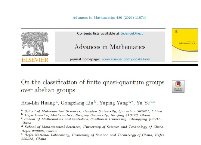 近日,学院杨毓萍副教授与合作者在国际著名数学期刊《Advances in Mathematics》上发表题为《On the classification of finite quasi-quantum groups over abelian groups》的研究论文,365英国上市集团数学与统计学院为通讯作者单位。《Advances in Mathematics》创刊于1961年,是数学领域公认的顶级期刊。该期刊致力于发表数学领域具有突破性的重要成果,享有很高的学术声誉。